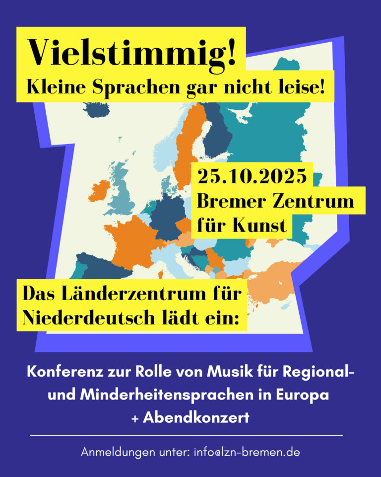 Europa lebt von seiner kulturellen und sprachlichen Vielfalt. Regional- und Minderheitensprachen wie Furlanisch (Italien), Westfriesisch (Niederlande) oder Nedersaksisch (Niederlande) verfügen über ein vielfältiges Kulturleben – nicht zuletzt in der Musik. Am 25. Oktober 2025 lädt das Länderzentrum für Niederdeutsch daher im Bremer Zentrum für Kunst zu einer Konferenz ein, die sich dem Potenzial von Musik für die Sichtbarkeit von Regional- und Minderheitensprachen in Europa widmet. Kurzvorträge über die Bedeutung von Musik für Furlanisch, Westfriesisch, Nedersaksisch, Sorbisch und Niederdeutsch bilden die Grundlage für Plenumsdiskussionen und weiteren Austausch in Kleingruppen.